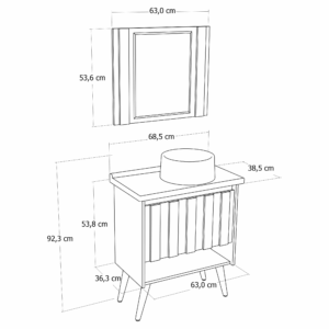 O armário kit Treviso possui composição harmoniosa entre espelheiro e armário, com design estilo ripado que o deixa mais moderno e bonito além de prático, com sua gaveta interna que facilita na organização dos objetos, nicho inferior com ótimo espaço interno e porta de bascular com pistão a gás para uma abertura suave. Sua estrutura é 100% em MDP – BP amadeirado ou texturizado, e possui várias opções de tampo e cuba de sobrepor    se adequando a todos os tipos de ambientes, e ao gosto do cliente.
